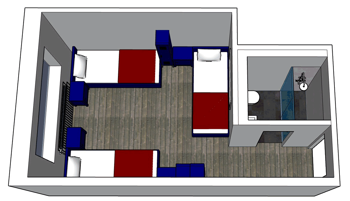 Dieses 3-Bett-Zimmer verfügt über drei Einzelbetten und ein privates Bad.
